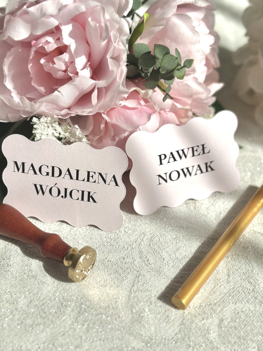 Nowoczesne winietki ślubne o wyjątkowym kształcie. Cięte na specjalistycznej maszynie, dostępne w wielu ciekawych i modnych kolorach. Stylowy dodatek na stół weselny. To hit sezonu 2025. Wykonane na papierze 250 – 300 gramów barwionym w masie.