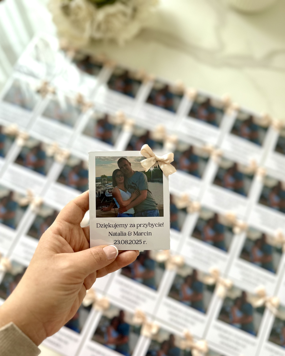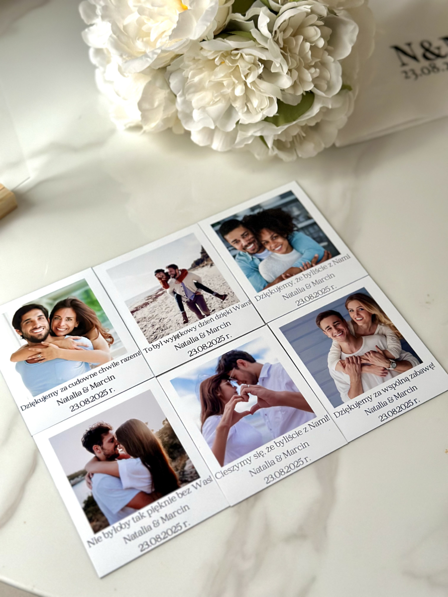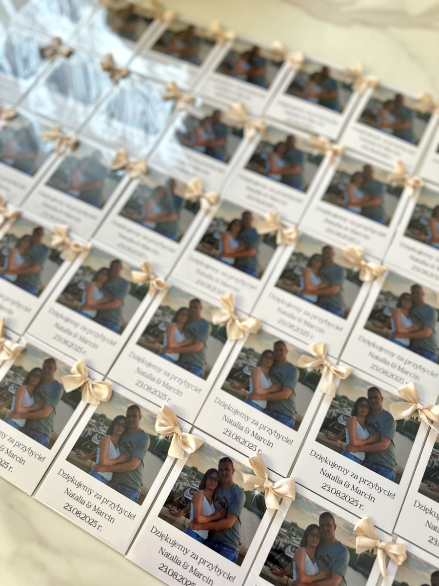 Podziękowanie dla Gości w formie fotomagnesu. Ozdobne opakowanie, kokardka lub perełka. Gotowy do wręczenia – elegancka pamiątka