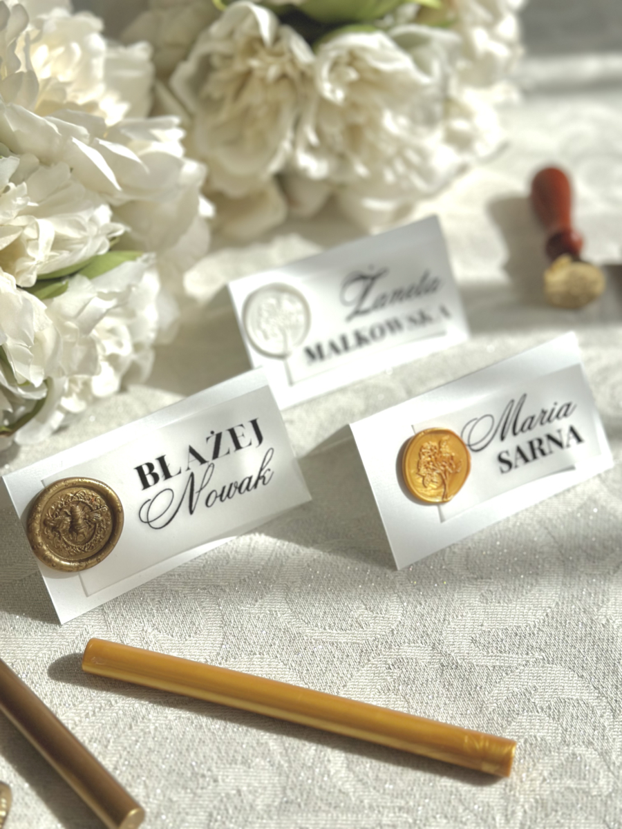 Eleganckie winietki ślubne w formie stojącej, wykonane na wysokiej jakości papierze o szlachetnej fakturze. Zdobione ręcznie wykonaną pieczęcią lakową oraz delikatnym akcentem z vellum – nadają aranżacji subtelnego uroku i klasy.