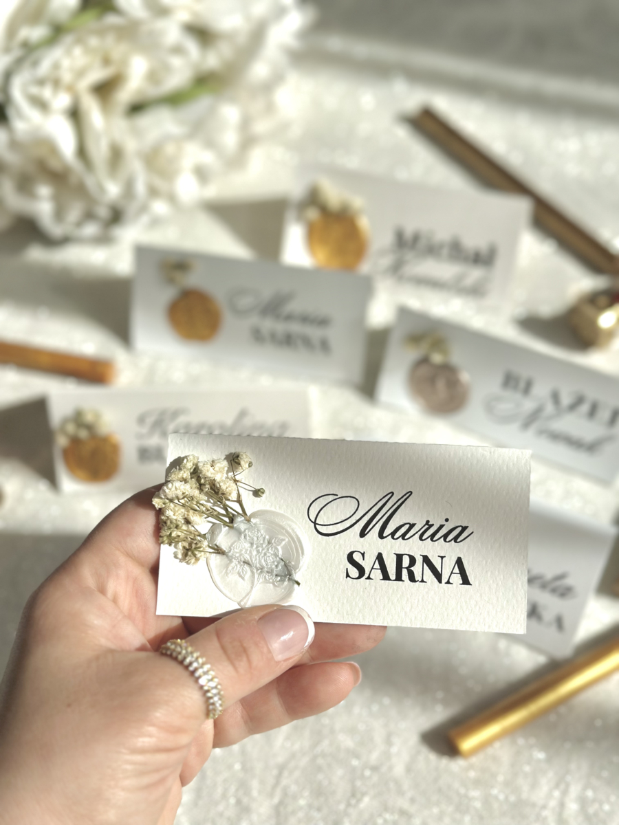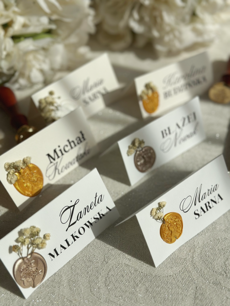 Stojące winietki ślubne DAPHNE to połączenie subtelności i klasy. Każda sztuka zdobiona jest ręcznie ułożonym kwiatem oraz pieczęcią lakową, dzięki czemu wprowadza wyjątkowy klimat na Waszym weselnym stole.