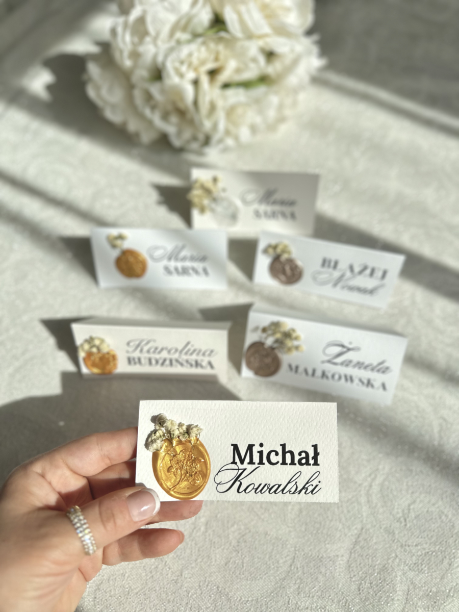 Stojące winietki ślubne z kolekcji DAPHNE to połączenie klasycznej formy z subtelnym, roślinnym akcentem i ręcznie wykonaną pieczęcią lakową. Każda winietka powstaje z największą starannością, by w dniu ślubu stała się nie tylko praktycznym oznaczeniem miejsca, ale także częścią dekoracji, która zachwyca i zostaje w pamięci.